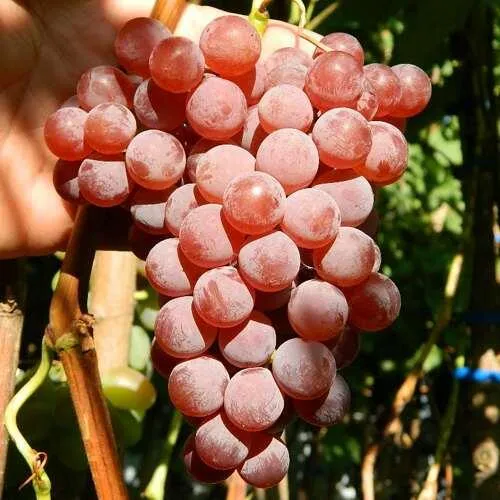 Ягоды винограда Кишмиш Красный обладают крупной овальной формой, в каждой из которых заключен ярко выраженный мускатный вкус. Каждая гроздь, впечатляющая своими размерами и цилиндроконической формой, весит до 500-650 г. Средняя плотность гроздей обеспечивает легкость в сборе и хранении, а вес одной ягоды составляет 5-6 г, что делает их идеальными для свежего потребления и приготовления изысканных блюд.
